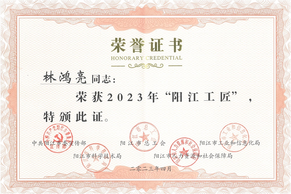 4月27日,2023年“阳江工匠”发布活动在市委会堂举行,广东广青金属科技有限公司首席工程师、技术质量部部长兼研究院副院长林鸿亮荣获2023年“阳江工匠”。
