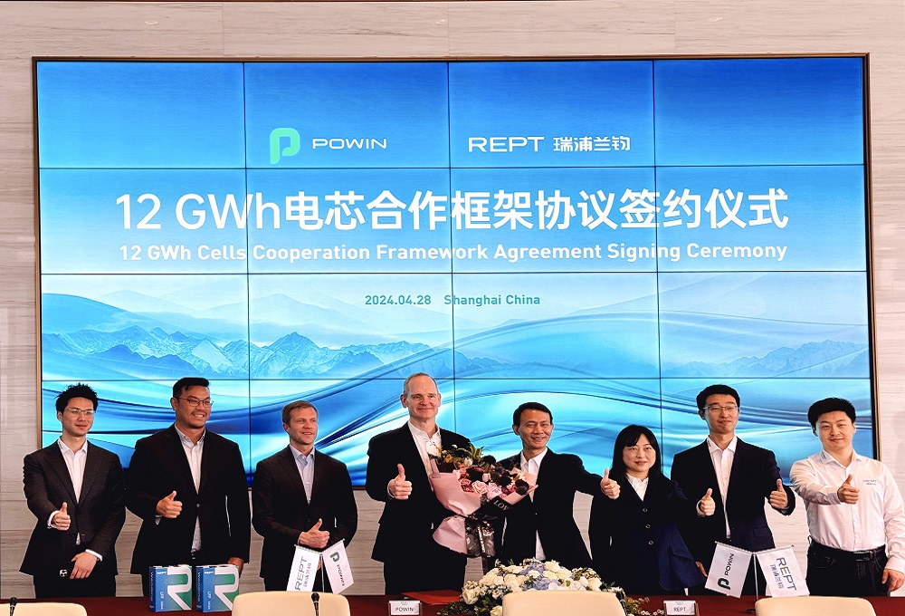 4月29日,瑞浦兰钧能源有限公司与全球知名储能集成商POWIN于上海PA视讯实业大楼正式签署12GWh问顶320Ah储能电芯合作框架协议。