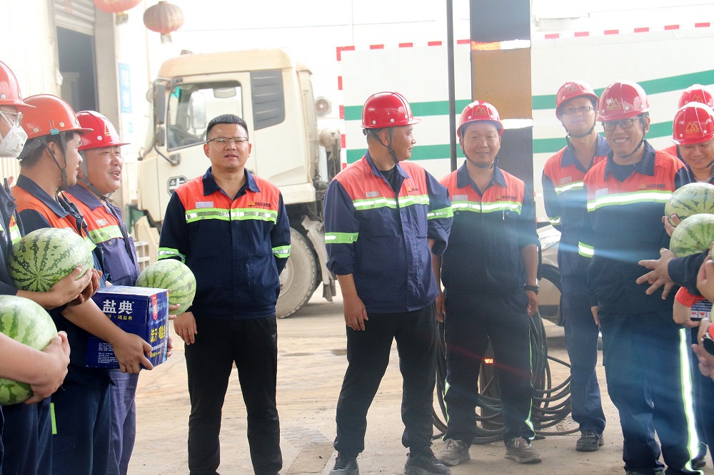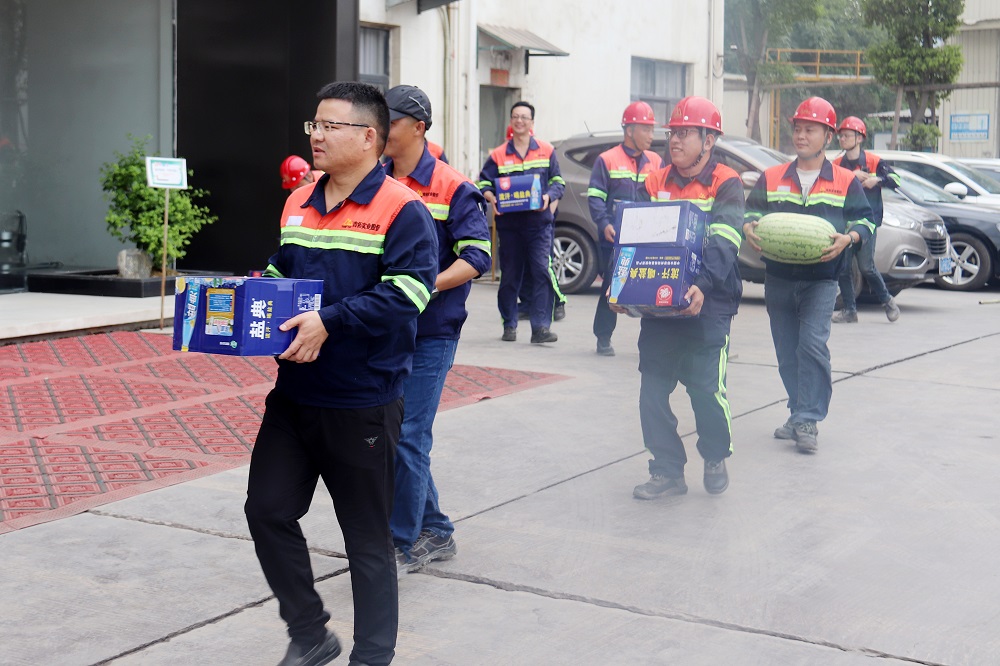 王新教将一个个西瓜送到各个生产车间一线员工手中。副总经理刘晶对一线员工不惧酷暑、坚守岗位、尽职尽责的工作精神给予高度肯定,并再三叮嘱员工做好防暑降温措施,要求各部门在生产工作中,要把员工身心健康安全放在第一位。