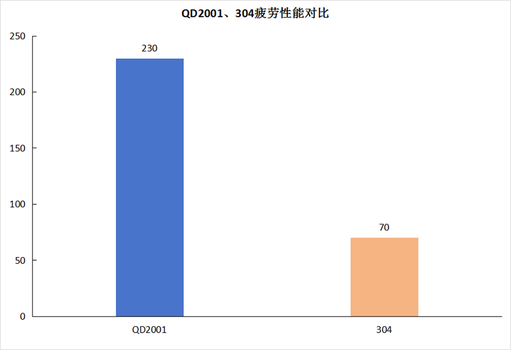 伴有更低的密度和热膨胀系数,高温下材质结构更为稳定,应用体积轻便。同时,QD2001具有更高的强度和硬度,屈服强度是304级不锈钢的近1.5倍,以及更高的弹性模量,可使电池紧固件更为轻质、高强。