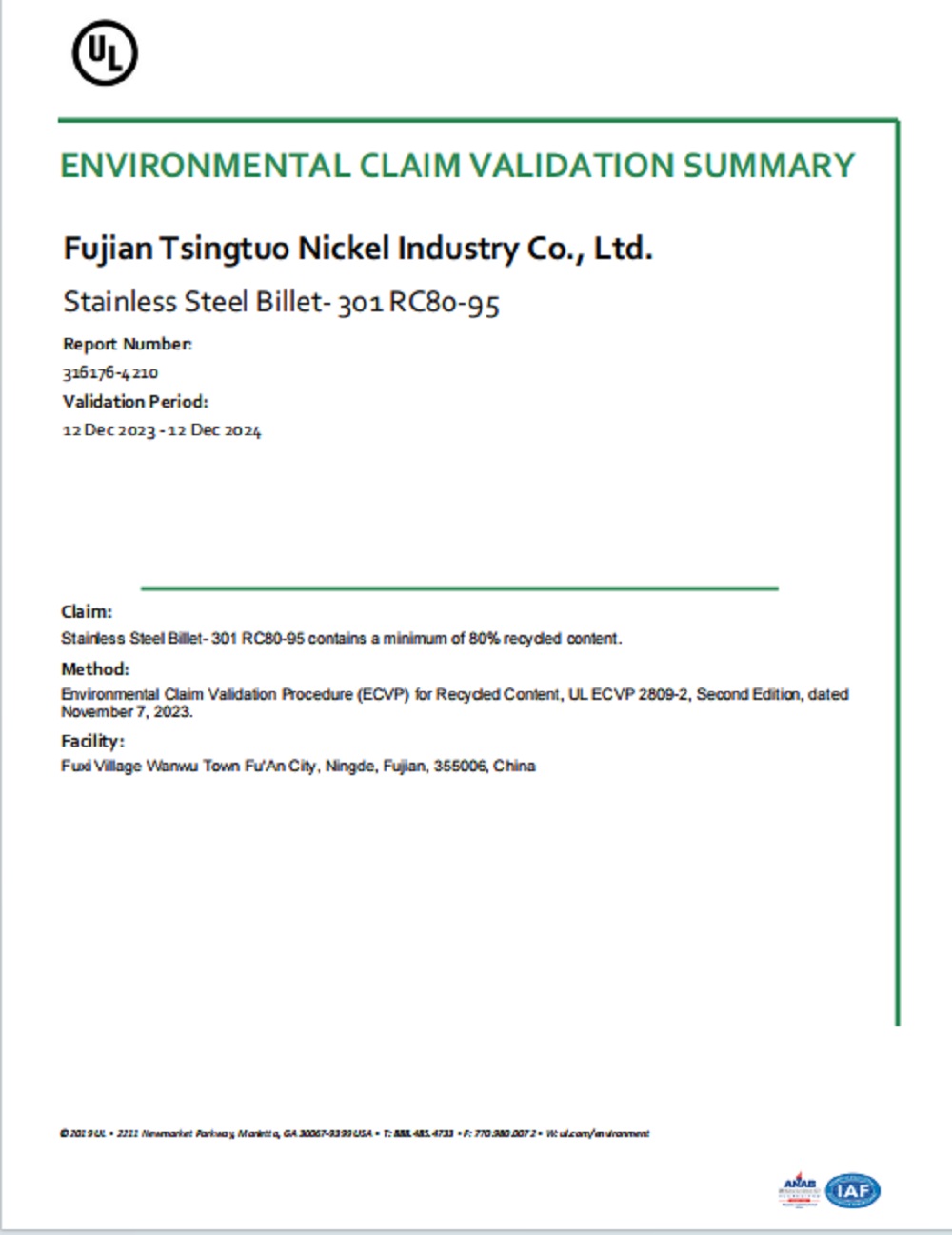 本次认证范围涵盖不锈钢坯、钢带两大类,包括301、304(L)、316(L)、SUS316L、20Cr13、30Cr13、40Cr13等产品牌号,整个数据收集及现场审核历时8个月。按照 UL2809再生料含量环保声明验证程序 (ECVP),经过专家全面的计算分析和审核验证,认证的不锈钢坯、钢带的再生料产品均符合标准要求。