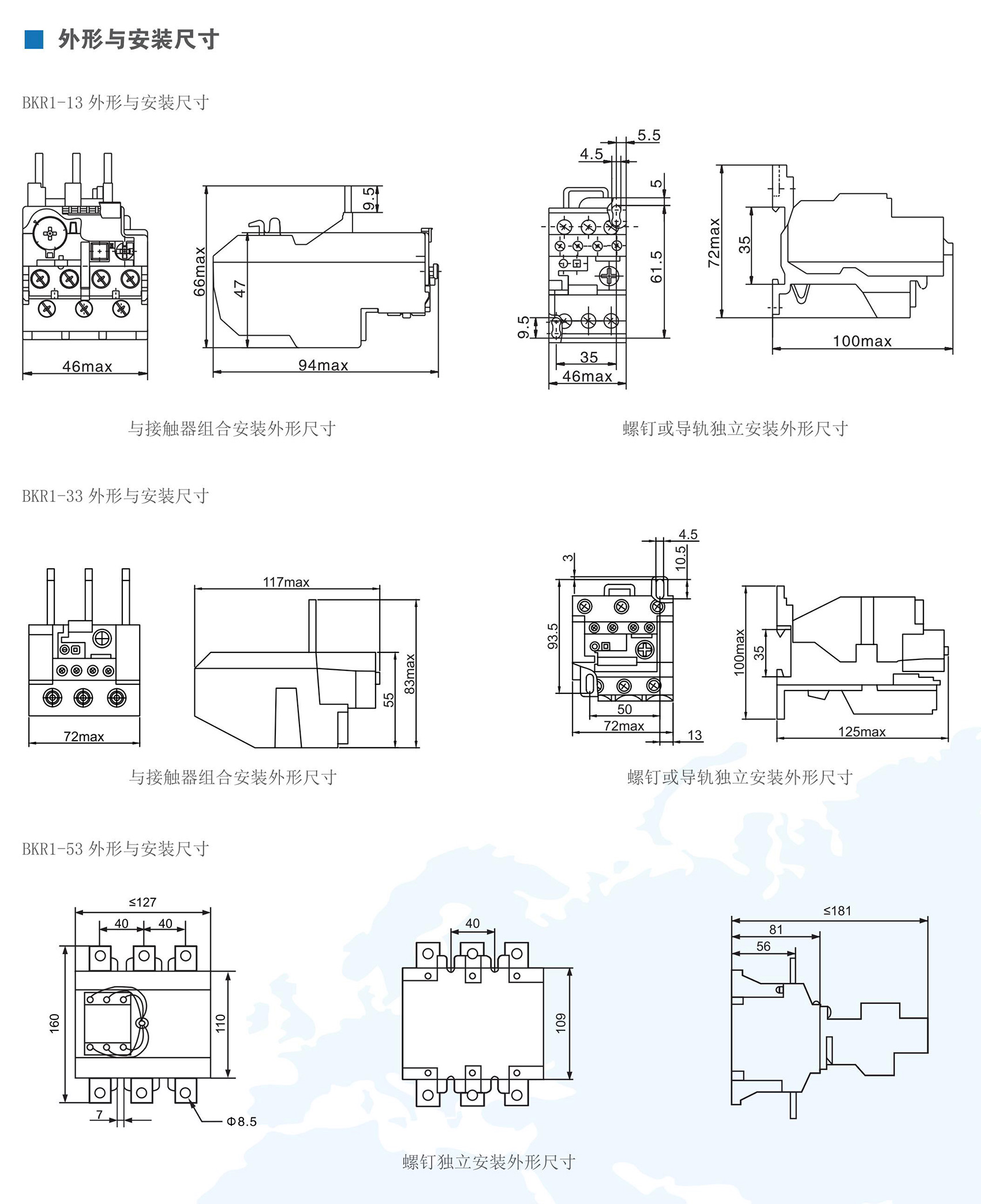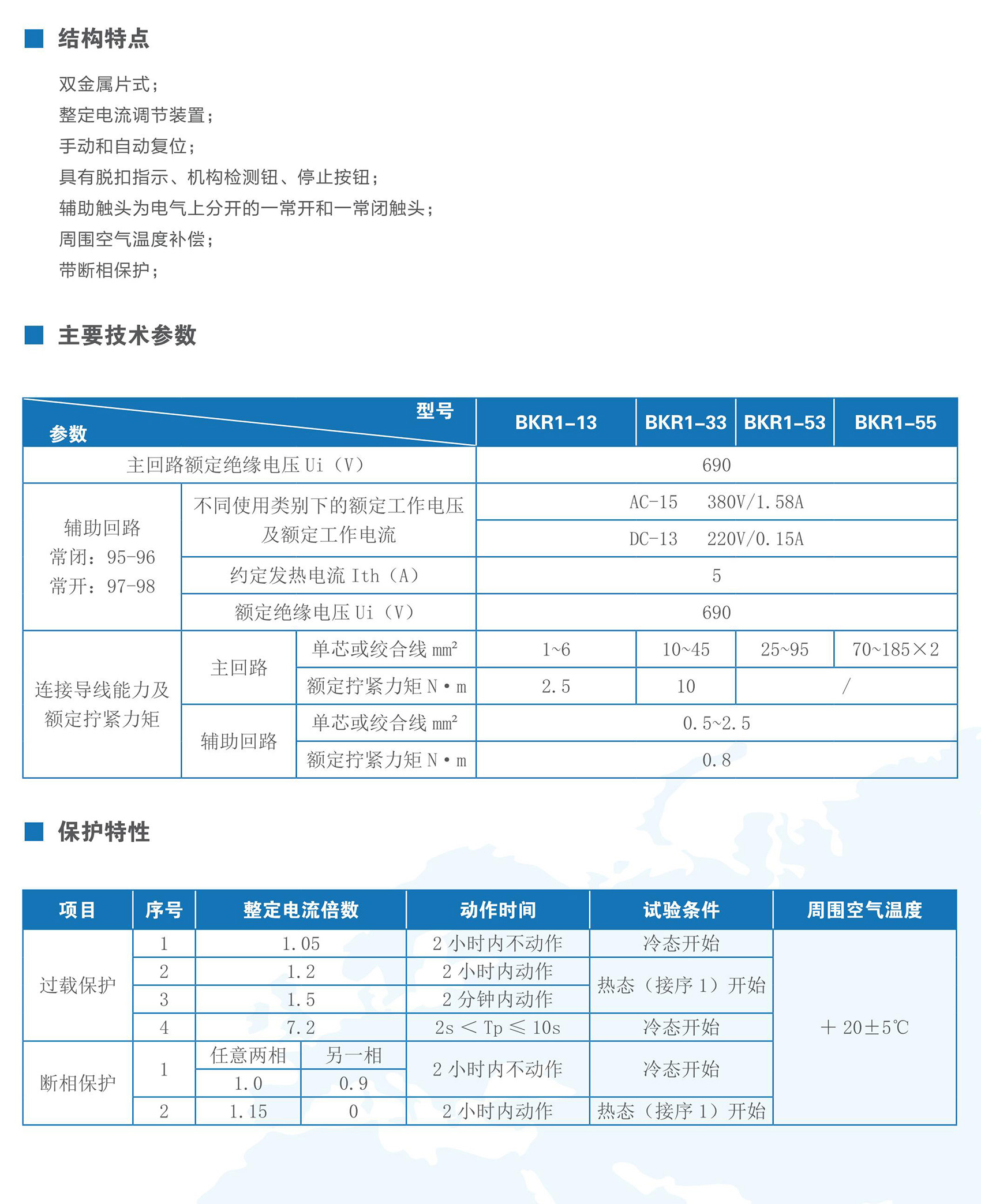 BKR1系列热过载继电器,在交流50Hz(60Hz)、额定电压至690V、电流0.1A至630A的电路中,作三相交流电动机的过载和断相保护之用。热过载继电器具有温度补偿、动作指示、自动和手动复位、停止等功能,性能稳定可靠。产品符合IEC 60947-4、GB/T 14048.4、GB/T 14048.5标准。