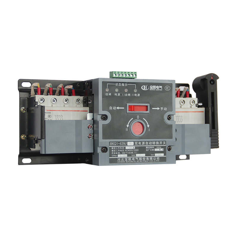 BKQ1-63N末端一体式双电源自动转换开关,适用于交流额定工作电压400V及以下、额定频率50Hz,额定工作电流63A及以下的双电源切换供电系统;产品具有电气联锁与机械联锁,确保两路电源不能同时供电;切换可靠,手动、自动切换均可;新型机构驱动完成切换过程,具有平衡、无噪音、冲击力小的优点;广泛适用于医院、商场、银行、消防、通讯、高层建筑等不允许停电的供电场所。产品符合GB/T 14048.11《低压开关设备和控制设备 第 6-1 部分:多功能电器 转换开关电器》。