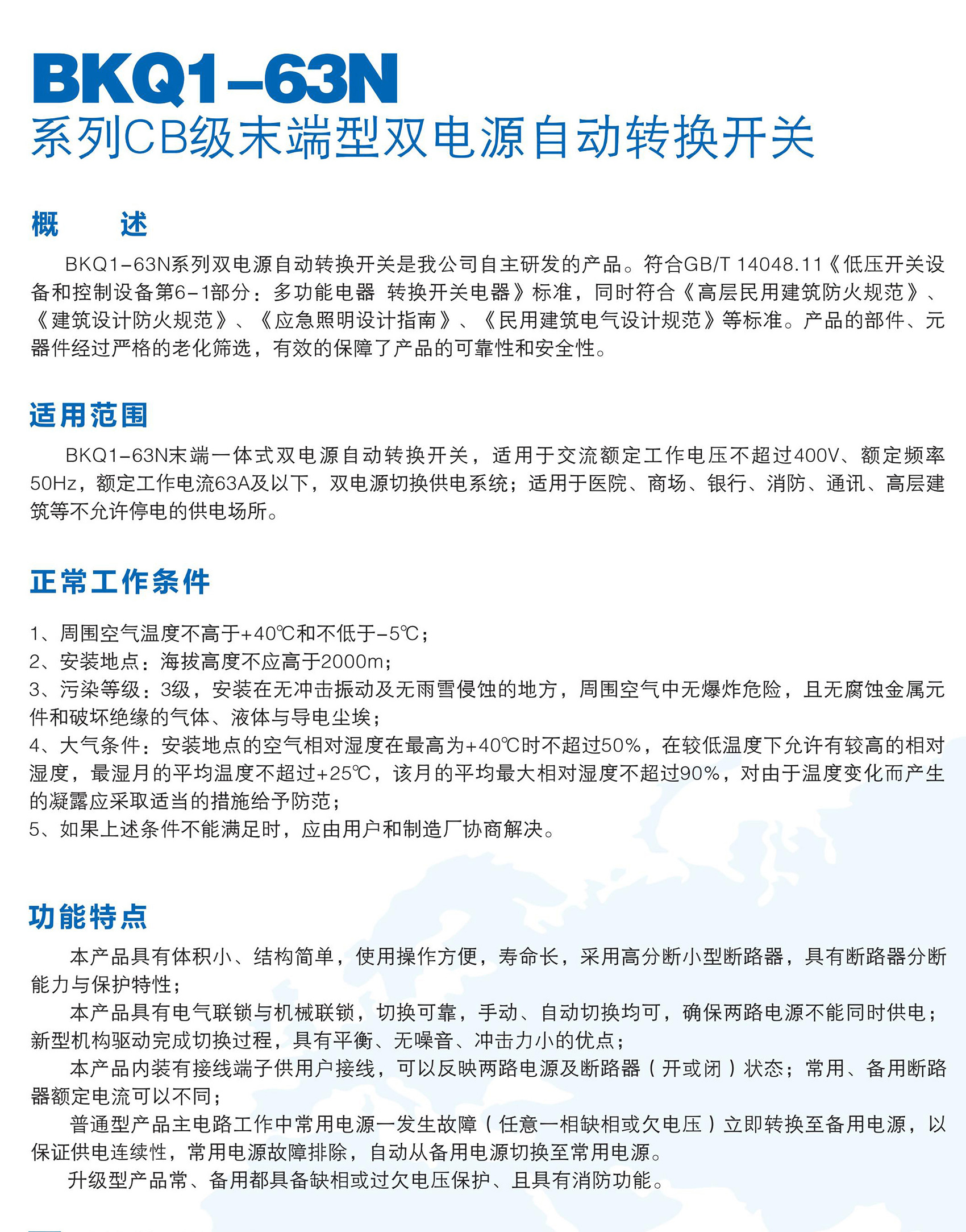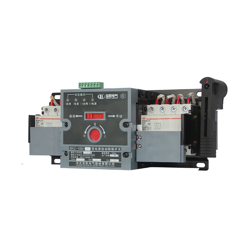 BKQ1-63N末端一体式双电源自动转换开关,适用于交流额定工作电压400V及以下、额定频率50Hz,额定工作电流63A及以下的双电源切换供电系统;产品具有电气联锁与机械联锁,确保两路电源不能同时供电;切换可靠,手动、自动切换均可;新型机构驱动完成切换过程,具有平衡、无噪音、冲击力小的优点;广泛适用于医院、商场、银行、消防、通讯、高层建筑等不允许停电的供电场所。产品符合GB/T 14048.11《低压开关设备和控制设备 第 6-1 部分:多功能电器 转换开关电器》。